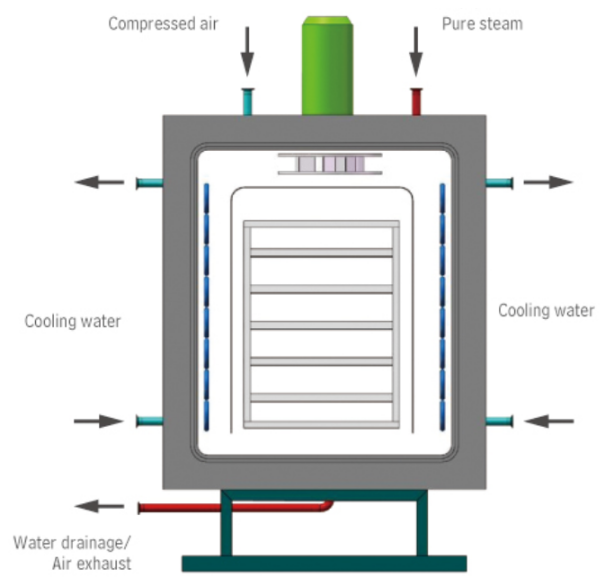 TFD Model Steam Air sterillizer is engineered for the counter pressure sterilization of aqueous solutions in sealed containers such as PVC, non-PVC packed LVPs parenterals, vials, PFS syringes, etc. It adopts pressured steam and air mixture sterilization process, The air circulation fan and air deflector mix the pure steam and air together to ensure sterilization temperature uniformity.Coiled pipes at the liner of chamber, is for drying and cooling of the loads, by connecting steam and cooling water. The hot air flows through the loads, while moisture on the surface evaporated, then cooling water in the coiled pipes can reduce the temperature rapidly.During the whole working process, the unique counter pressure control can prevent sealed container from deforming or cracking due to excessive pressure difference between the inside and outside.